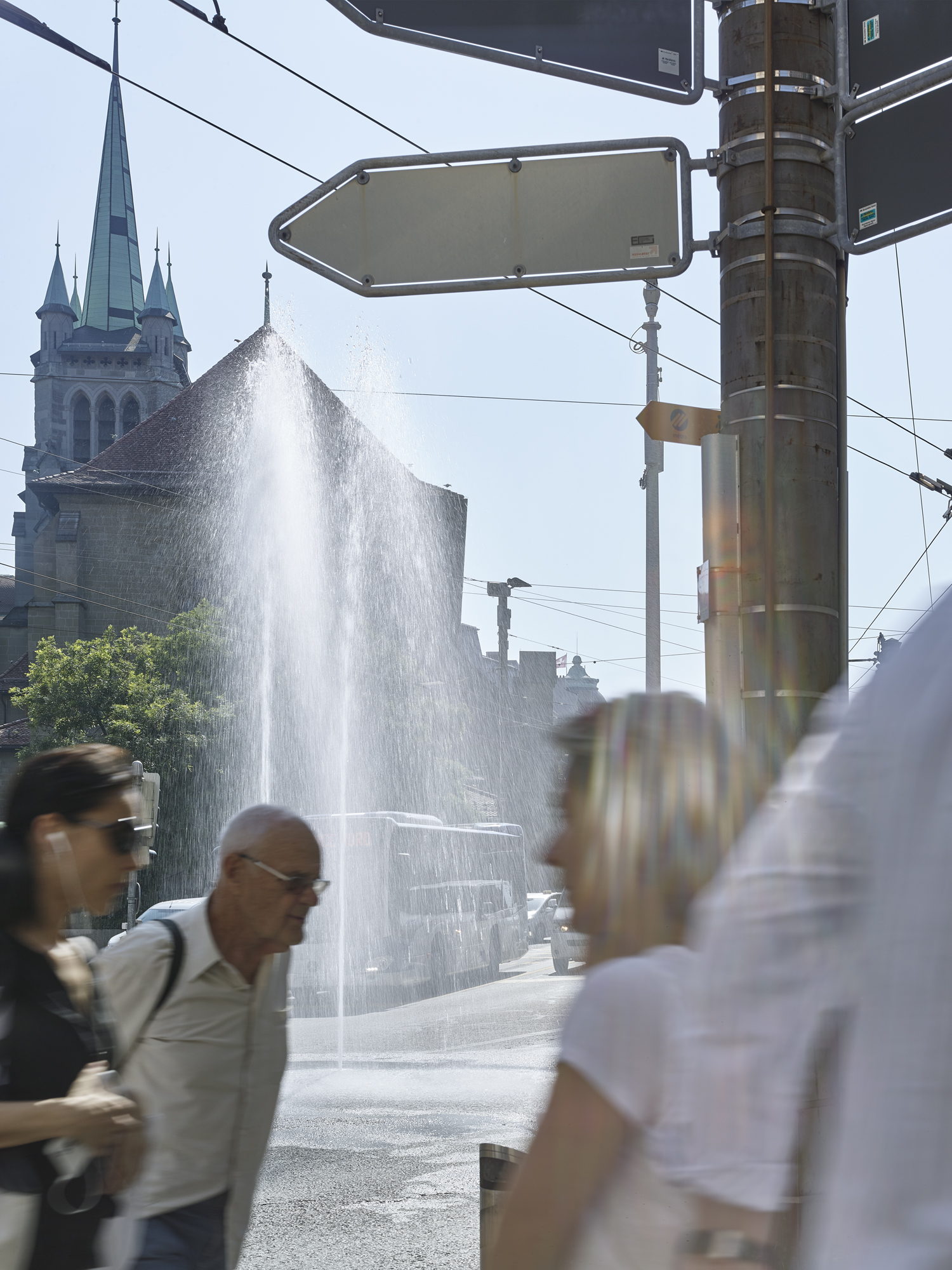 Ein Wasserstrahl, der für einen Moment den Verkehrs- und unseren Gedankenfluss unterbricht. Das aus den Tiefen des städtischen Bodens sprudelnde Wasser, das als Naturgewalt seine Rechte plötzlich zurückholt. Wasser im ewigen Durchfluss wie die Menschen unter der Place Saint-François, das in unterirdischen Leitungen eingesperrt fortwährend vom Ort seiner Reinigung zu dem seines Verbrauchs transportiert wird… Da es den Rohren und seiner Bestimmung entflieht, schenkt es uns ein bisschen Freiheit, eine neue Art der Wahrnehmung, es öffnet uns die Augen. Für einige Sekunden, während eines Moments der Stille, richtet sich der Blick zum Himmel und wird alles um uns herum sichtbar: die Grösse des Kosmos und die ihm innewohnenden Möglichkeiten.