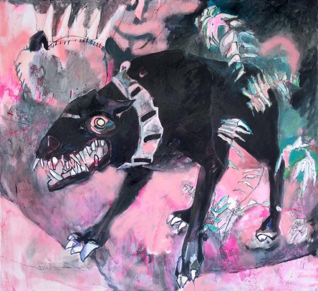 Nadja Kirschgartens Bilder greifen diesen Sehnsuchtsgedanken auf: Sie gleichen einem sich Eindenken. Einem Rückspüren. Einem Tieferfühlen in etwas Verborgenes, das den Dingen zu Grunde liegt. Ihre Welt zeigt Szenerien eines symbiotischen Kosmos zwischen Mensch, Tier und Natur. Pittoreske Gefühlsgewalt trifft dort auf brachiale Körperwesen. In weichen organischen Farben von Rosa, Pink und Rot wird eine Umgebung skizziert, in der abstrakte Wesen ein Zuhause finden: Schwarze Hunde, die mit geifernden Zähnen die Begleiter in dieser Wildnis sind. Pinke Rössli, die mit schwarzen Köpfen auf hell erleuchteten Weiden grasen und mit unbelebten Augen auf den Betrachter blicken.