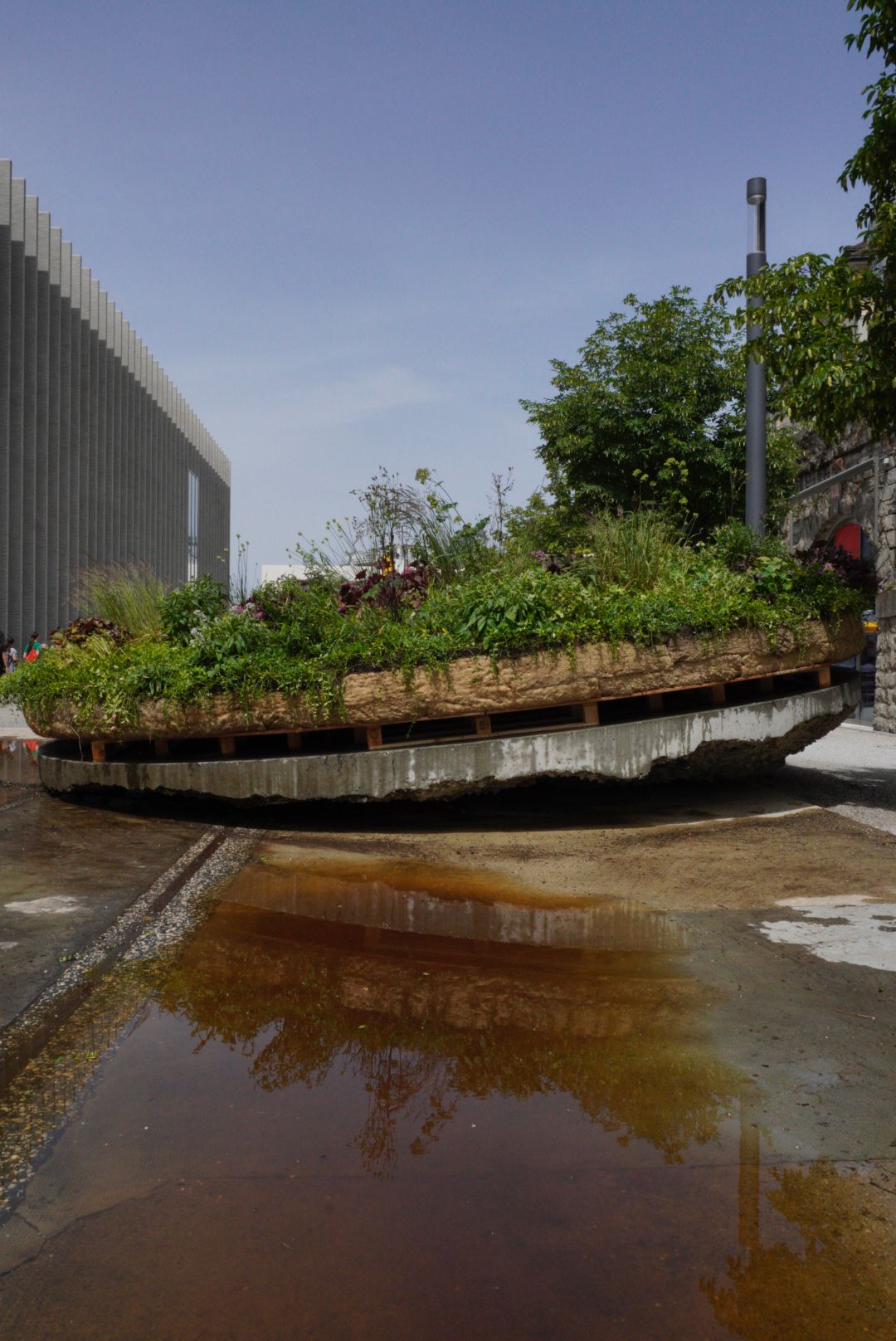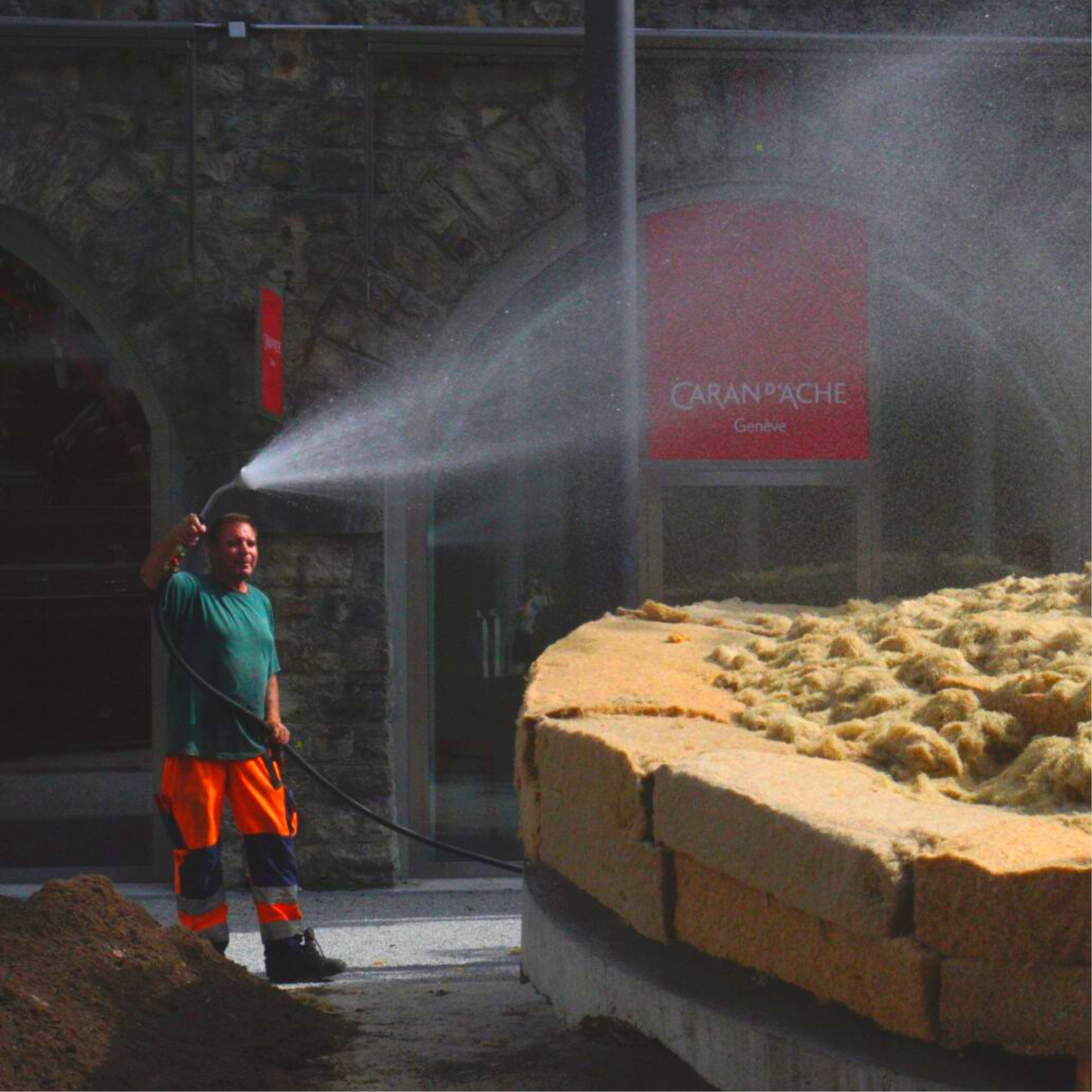 Städte sind besonders stark vom Klimawandel betroffen. Häufig sind sie fünf bis zehn Grad Celsius wärmer als ihr Umland. Grünräume sind heute in allen Teilen der Schweiz ein wichtiger Faktor der Stadtplanung. Das Lausanne der Zukunft wird eine Schwammstadt sein, in der Pflanzen und Böden das Wasser zurückhalten und für eine erhöhte Verdunstungskühlung sorgen. Schwamm drüber! lässt neues Leben entstehen, wo altes nicht mehr möglich ist. Grün auf Asphalt. Etwas, das wächst. Von unten nach oben, von innen nach außen. Inmitten eines öffentlichen Raums, zwischen Museum, Besucher*innen, Baustelle. Schwamm trifft auf Aspahlt, Mensch trifft auf Objekt. Wachsen kann nur, was zuerst gesät, gepflegt, begleitet wird. Und Veränderung kann nur entstehen, wenn man sie anstößt, Kritik und Diskurs wagt, in Dialog tritt.