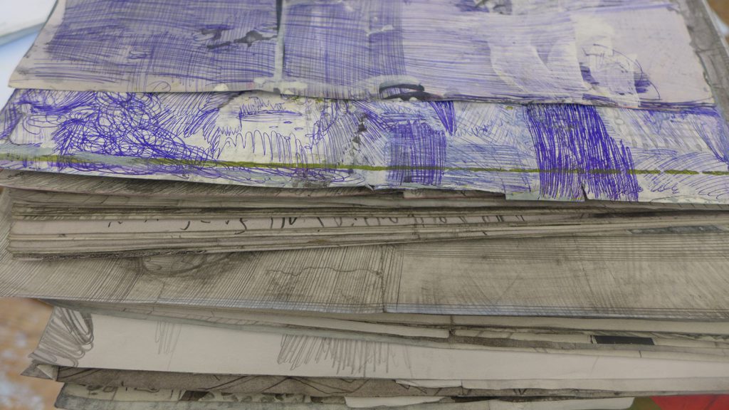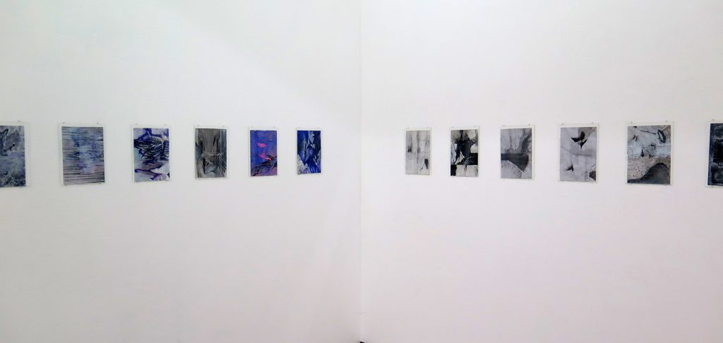 Für seine Zeichnungen nutzt der Künstler weisses A4-Kopierpapier. Ein schlichtes und einfaches Material, 210 x 297 cm. Dies sind die Masse, innerhalb derer Roland Dostal Schichten der Wirklichkeit offenlegt und sichtbar macht. Der Künstler arbeitet mit Bleistift und Kugelschreiber. Auf den Papieren begegnen sich Formen und Farben, die natürlich aufeinander reagieren, sich gegenseitig heranziehen und wieder fallen lassen, eine Berührung suchen, um sie wieder aufzuheben und Neues zu finden. Klar unterscheiden sie sich und stehen doch im lebendigen Dialog, in einer zirkulierenden Bewegung der Überlagerung und des sich ineinander Verflechtens. Es scheint sich Licht durch eine tiefe und doch transparente Oberfläche zu brechen. Einem strukturiertem Gewebe gleich, das aus zahlreichen Fasern und Verästelungen besteht. Äusserlich gewinnt das Papier durch wiederholte Faltung an Struktur; Raster graben sich in die glatte Oberfläche und öffnen eine weitere Ebene, in der Formen aufeinander reagieren. Die klare Individualität sowie die so verletzliche Beschaffenheit der Arbeiten erinnert an einen ausgestellten Körper, auf dessen Haut sich die Spuren der Zeit zeigen.