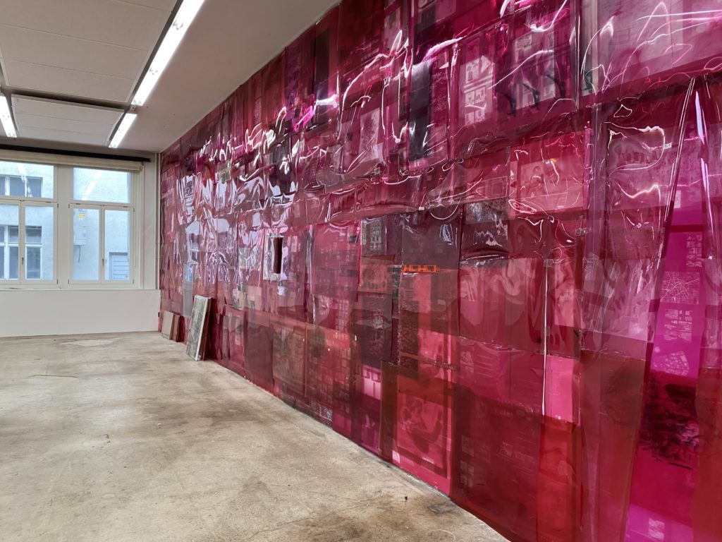 Sichtbar ist: Eine weitläufige Wand, deckenhoch. Schichten aus roten Montagefolien übereinander mit verschiedenen Belichtungen. Erkennbar sind Motive von Menschen, lachend, weinend, mit Sommerhut und ohne, dann Tiere, Kalenderbilder, Werbebilder zusammengefasst: Bilder von Welt oder die Bilder, die wir als Welt verstehen. und die Weltbilder machen. Barths Methode: Auf Folie verbinden sich bestehende Bilder zu einem neuen Objekt: rot + Wand wird ROTEWAND, ein neues Produkt.