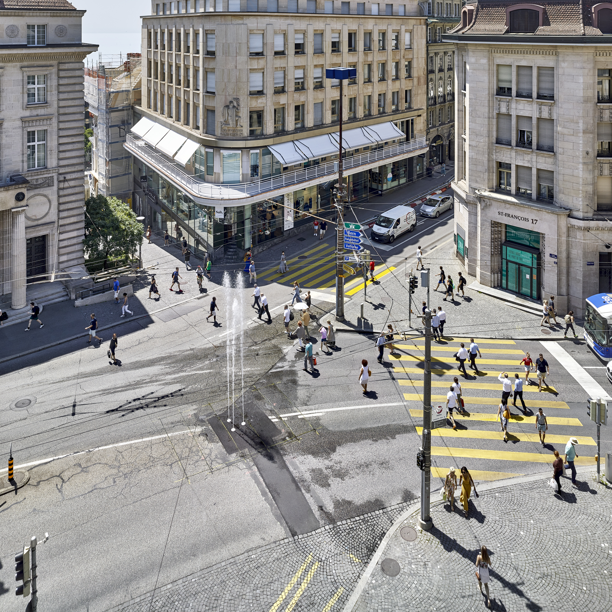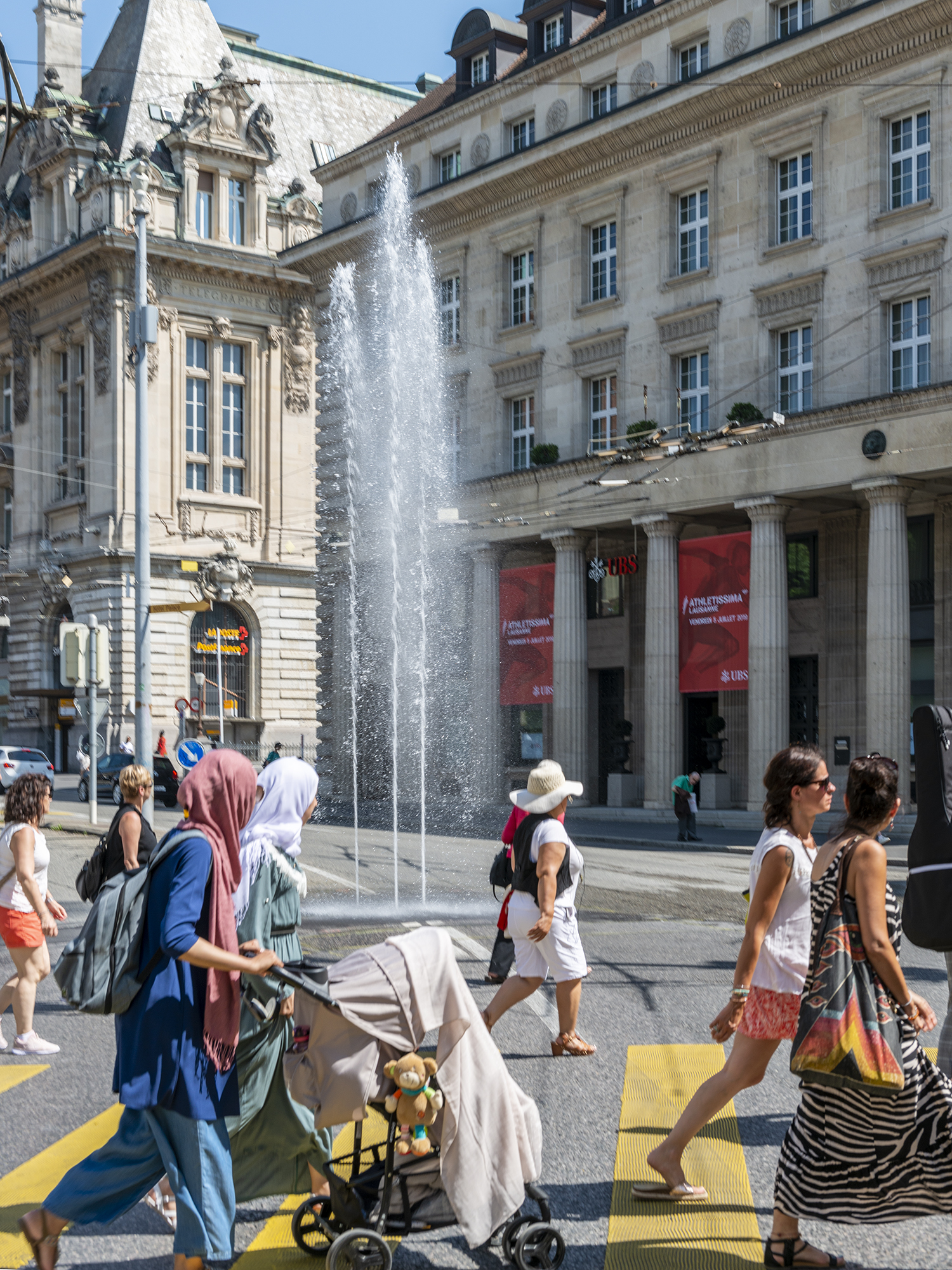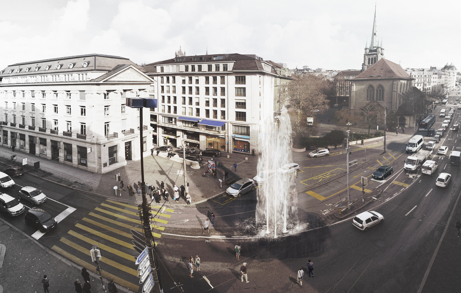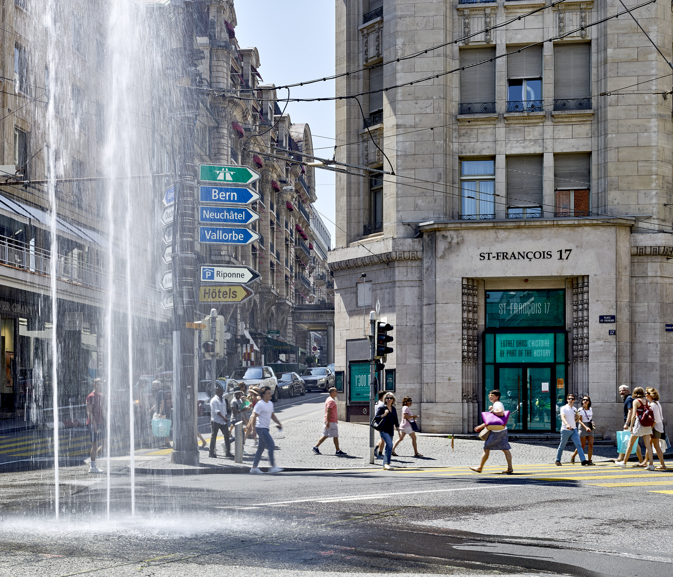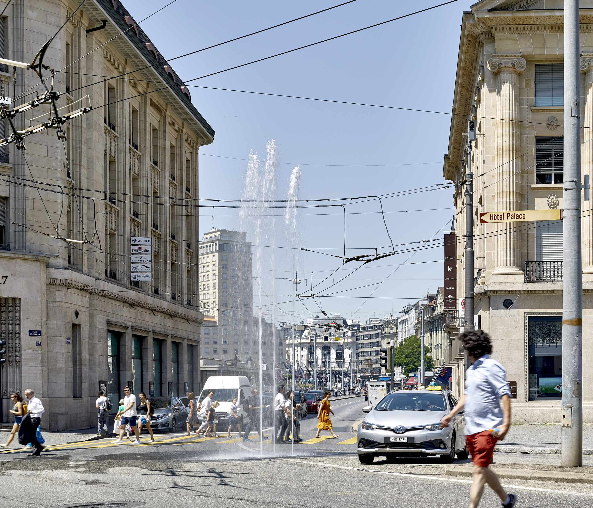 Ein Wasserstrahl, der für einen Moment den Verkehrs- und unseren Gedankenfluss unterbricht. Das aus den Tiefen des städtischen Bodens sprudelnde Wasser, das als Naturgewalt seine Rechte plötzlich zurückholt. Wasser im ewigen Durchfluss wie die Menschen unter der Place Saint-François, das in unterirdischen Leitungen eingesperrt fortwährend vom Ort seiner Reinigung zu dem seines Verbrauchs transportiert wird… Da es den Rohren und seiner Bestimmung entflieht, schenkt es uns ein bisschen Freiheit, eine neue Art der Wahrnehmung, es öffnet uns die Augen. Für einige Sekunden, während eines Moments der Stille, richtet sich der Blick zum Himmel und wird alles um uns herum sichtbar: die Grösse des Kosmos und die ihm innewohnenden Möglichkeiten.