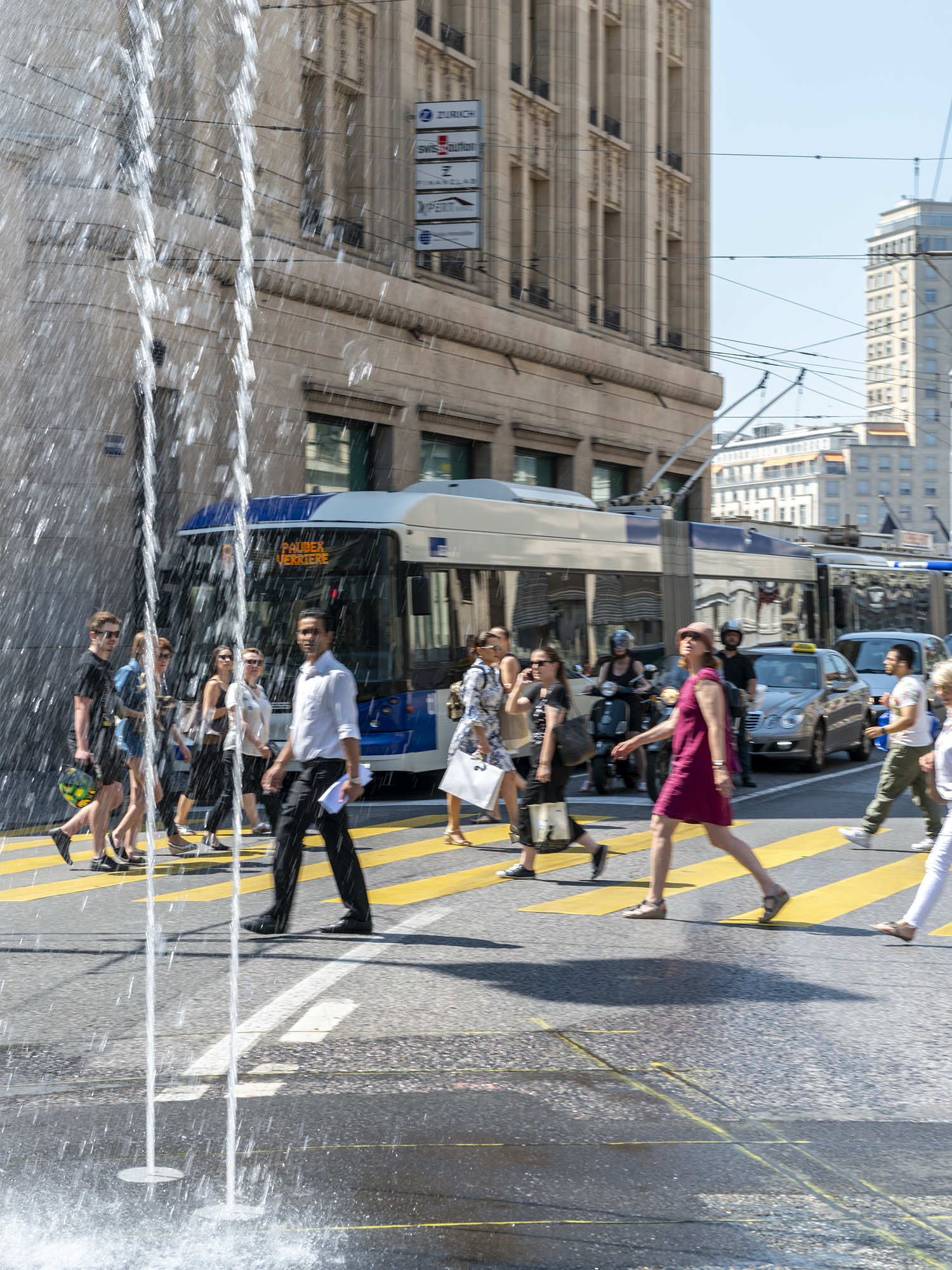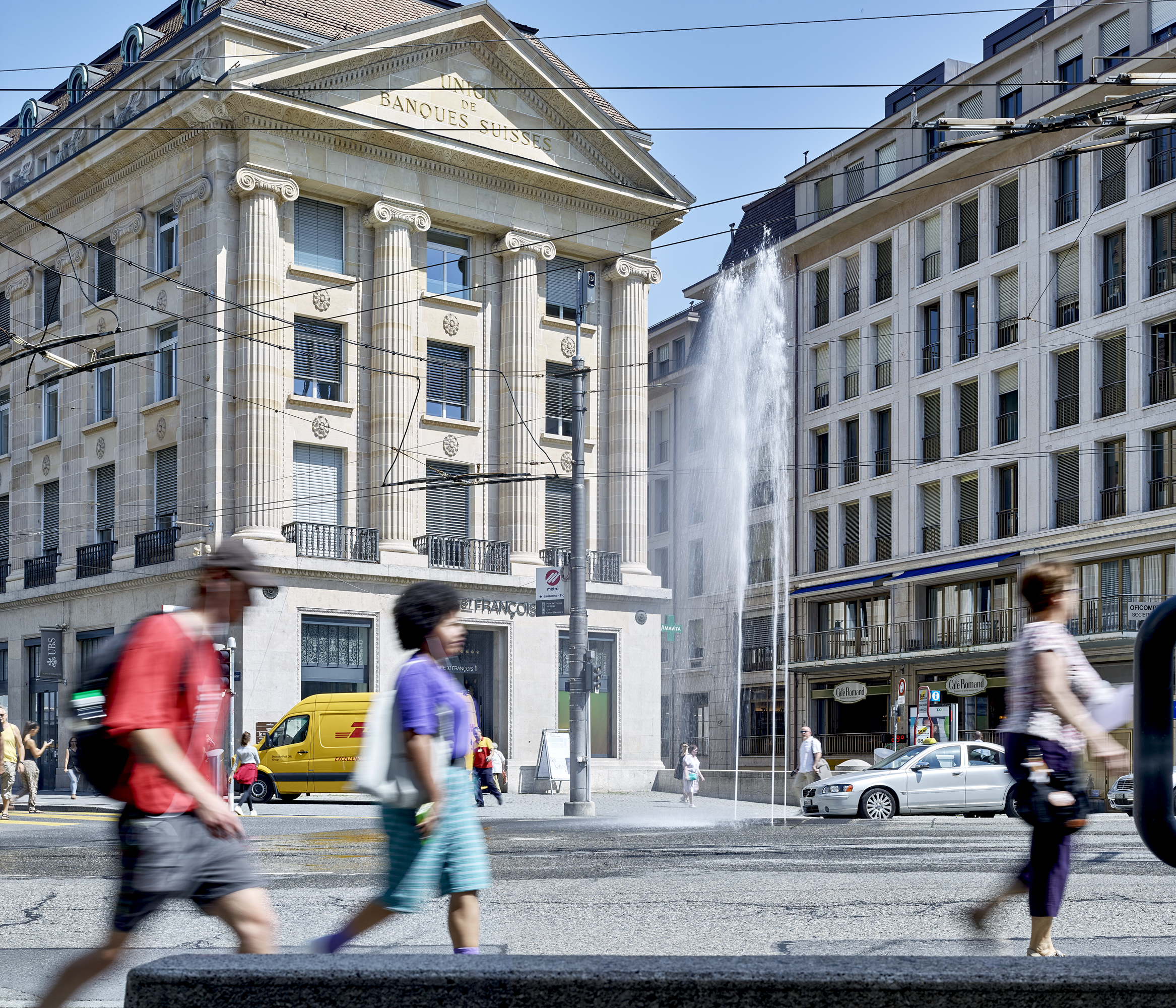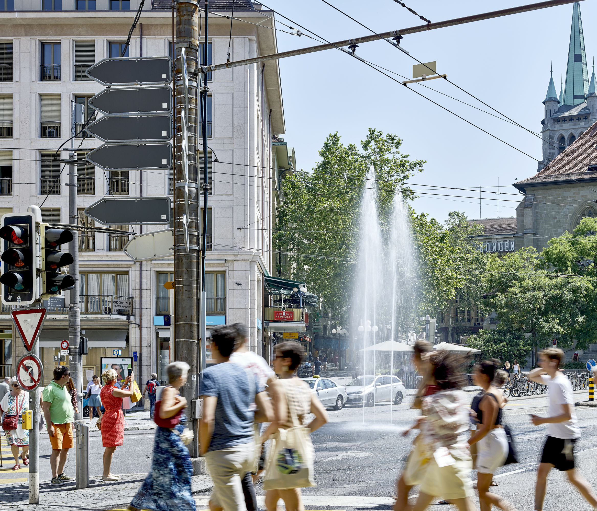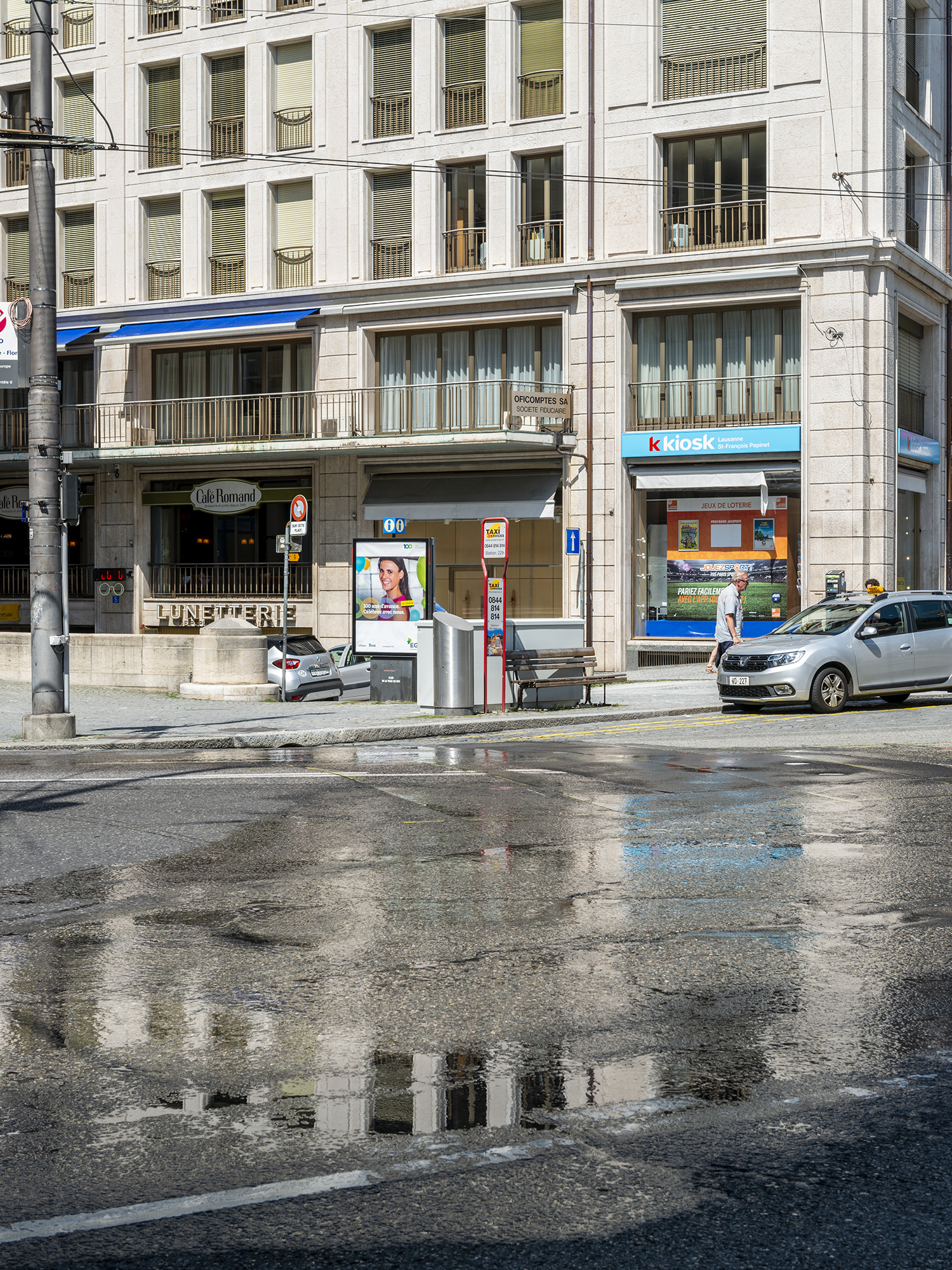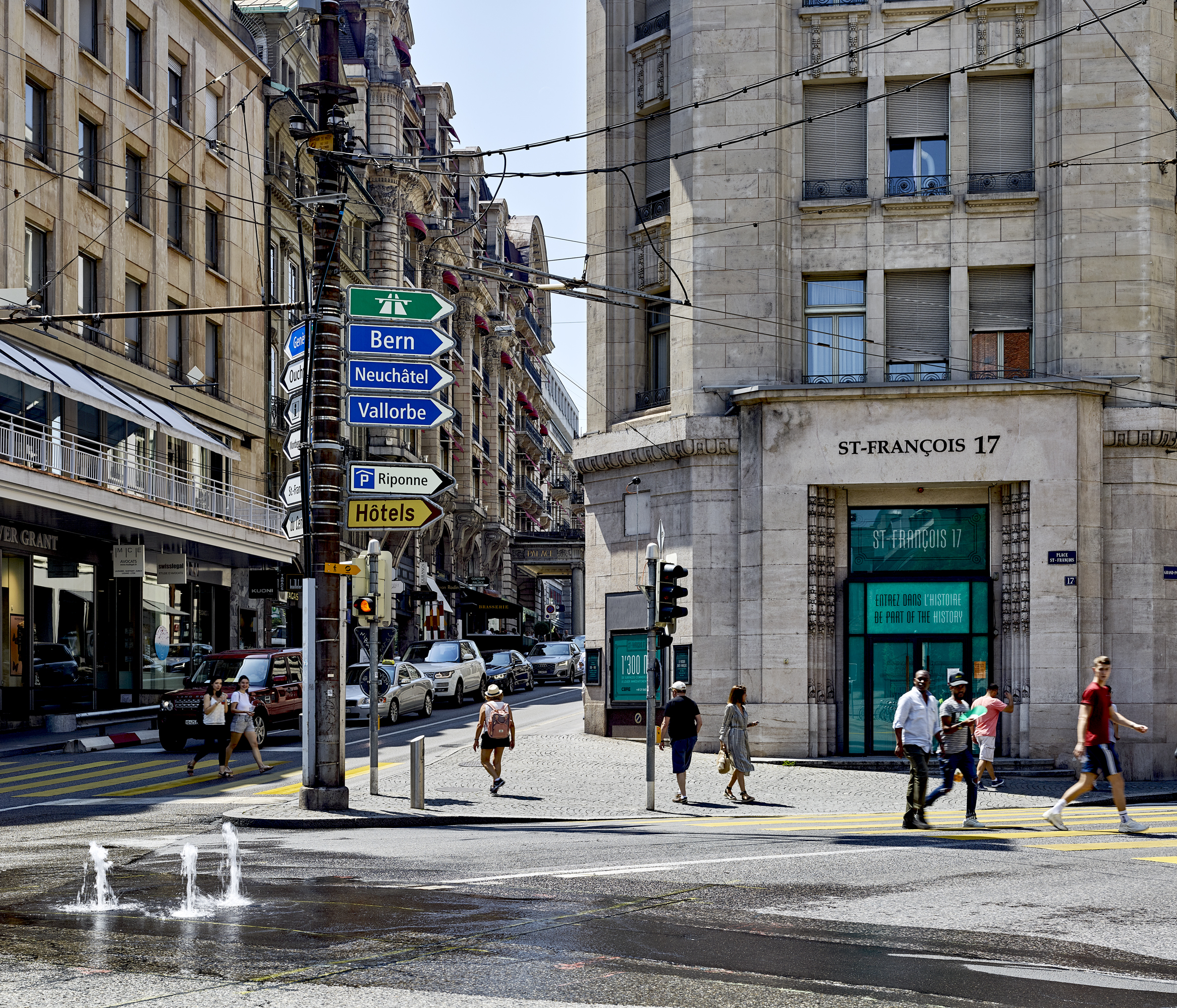 Ein Wasserstrahl, der für einen Moment den Verkehrs- und unseren Gedankenfluss unterbricht. Das aus den Tiefen des städtischen Bodens sprudelnde Wasser, das als Naturgewalt seine Rechte plötzlich zurückholt. Wasser im ewigen Durchfluss wie die Menschen unter der Place Saint-François, das in unterirdischen Leitungen eingesperrt fortwährend vom Ort seiner Reinigung zu dem seines Verbrauchs transportiert wird… Da es den Rohren und seiner Bestimmung entflieht, schenkt es uns ein bisschen Freiheit, eine neue Art der Wahrnehmung, es öffnet uns die Augen. Für einige Sekunden, während eines Moments der Stille, richtet sich der Blick zum Himmel und wird alles um uns herum sichtbar: die Grösse des Kosmos und die ihm innewohnenden Möglichkeiten.