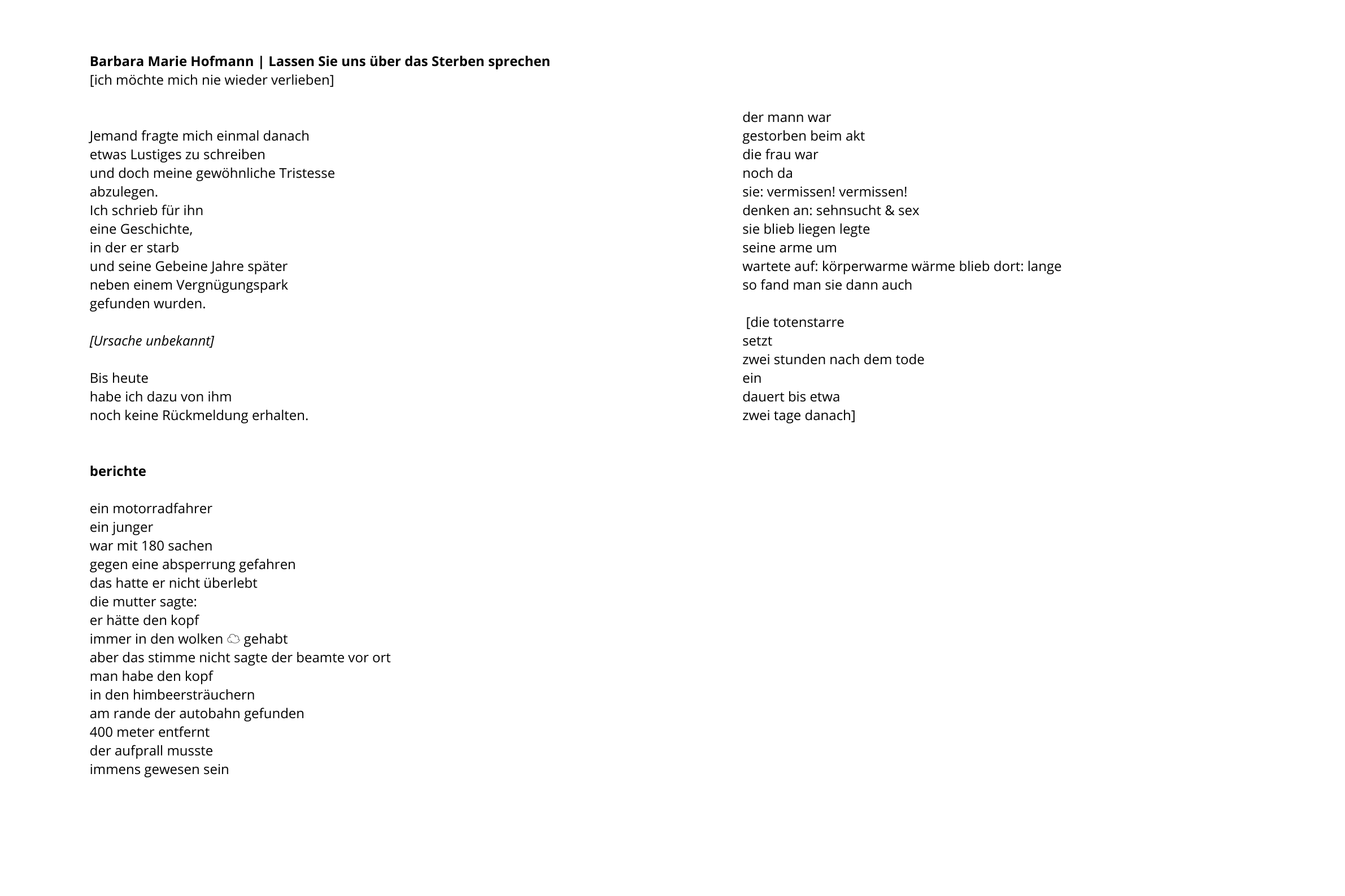 Rosa Anschütz und Jan Wagner, Mohamed Badawi, Anna Laura Bach, Alexander Binder, Fabian Vorragend, DAIF und bordeaux lip, Veronika Fischer, Michelle Hanselowski, Christof Heppeler, Laura Maria Heppeler, Toby Hoffmann, Barbara Marie Hofmann, Jessica Jurassica, Alisa Lang, Bragi Lohde, Christine Leutkart, David Grodock, Jörg Mandernach, Nina Maier, Almira Medaric, Marius Nanni, Monika Nuber, José Oliver, Nathan Lüders, Hellmut Preiss, Markus Preiss, Ester Irina Pschibul, Sigurdur P. Hardarson, Thomas Putze, Christina Pirker, resident spambot, Tobias Rüetschi, Stefanie Scheurell, Sofie Schnellbach, Sveinbjörn I. Baldinsson, Felicia Zepf.