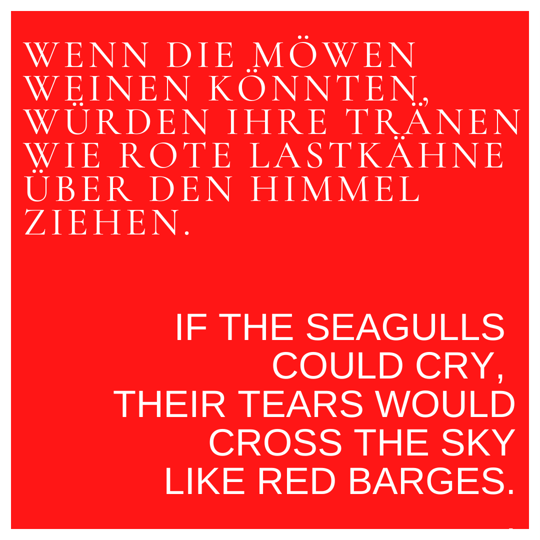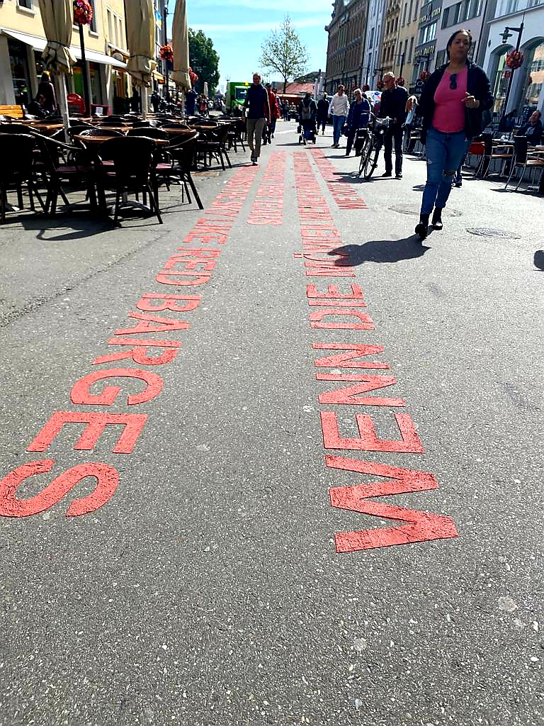 Das Kulturamt der Stadt Konstanz hat die Autorin und Künstlerin Barbara Marie Hofmann eingeladen, mit der öffentlichen Textinstallation »möwen, bodennah« Lyrik im öffentlichen Raum der Stadt Konstanz sichtbar zu machen. Gedanken zum Mitnehmen, Weiterdenken, Mitsichtragen. Für ein Miteinander und für einen Austausch, unter freiem Himmel. Im Herzen der Stadt, auf dem Boden der Marktstätte Konstanz werden vier deutsche und englischsprachige Gedichte großformatig mittels Straßenmarkierungsfarben aufgetragen. Worte, die den Boden, der uns trägt, beschreiben und gestalten. Ein Gewebe aus Sprache, das Stadt, See und Mensch verbindet. Begleitend zur Textinstallation erscheint ein Banner mit Textelementen, das in der Hussenstraße gehängt wird.