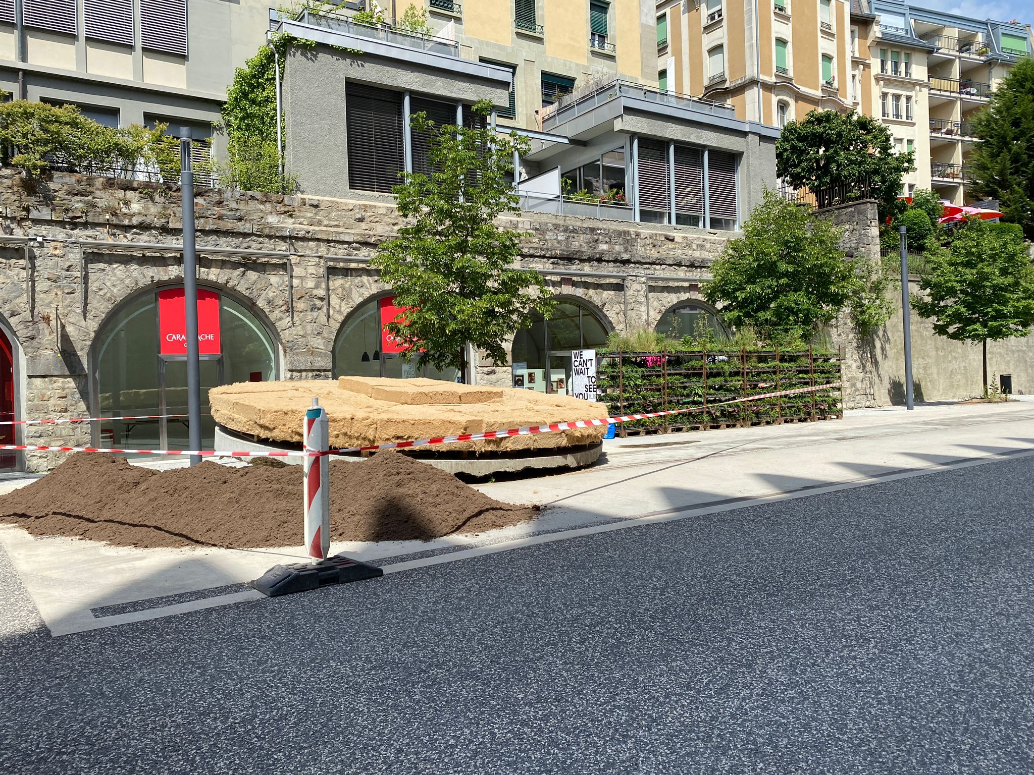 Städte sind besonders stark vom Klimawandel betroffen. Häufig sind sie fünf bis zehn Grad Celsius wärmer als ihr Umland. Grünräume sind heute in allen Teilen der Schweiz ein wichtiger Faktor der Stadtplanung. Das Lausanne der Zukunft wird eine Schwammstadt sein, in der Pflanzen und Böden das Wasser zurückhalten und für eine erhöhte Verdunstungskühlung sorgen. Schwamm drüber! lässt neues Leben entstehen, wo altes nicht mehr möglich ist. Grün auf Asphalt. Etwas, das wächst. Von unten nach oben, von innen nach außen. Inmitten eines öffentlichen Raums, zwischen Museum, Besucher*innen, Baustelle. Schwamm trifft auf Aspahlt, Mensch trifft auf Objekt. Wachsen kann nur, was zuerst gesät, gepflegt, begleitet wird. Und Veränderung kann nur entstehen, wenn man sie anstößt, Kritik und Diskurs wagt, in Dialog tritt.